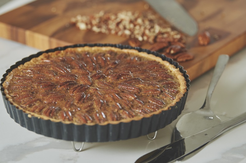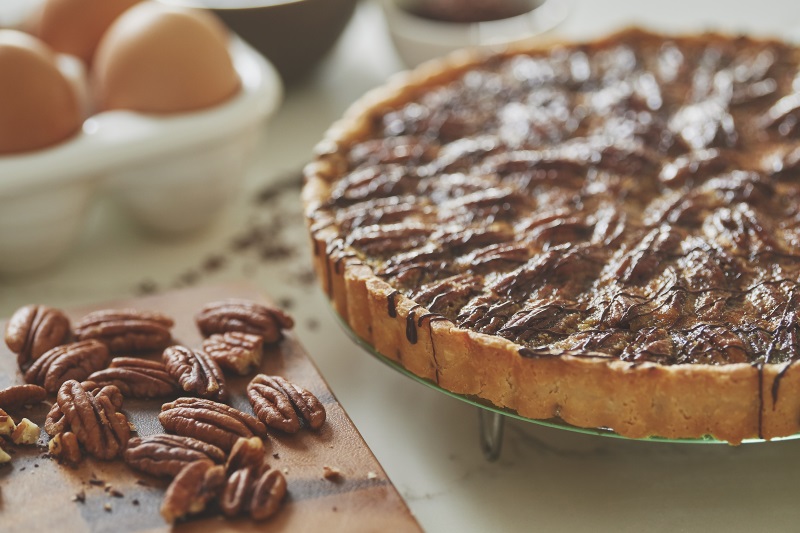 US pecans are the star of O’Chim’s cheerful tart, sitting pretty in golden syrup, in a shell made with cream cheese and butter. Seductively laced with dark chocolate.